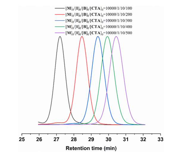 为了在合成低分子量的PPO中最大限度地减少PVP-1B/铵盐二元体系的负载,他们通过添加链转移剂(CTA)来合成结构明确的低分子量PPO(Mn<10 kg/mol)。在25°C下,他们选择烯丙醇(AA)作为PO均聚的CTA,并筛选与不同AA进料比例条件下进行PO的聚合,所得聚环氧丙烷(PPO)的数均分子量(Mn)随着AA量的增加而线性下降。所得PPO的GPC曲线都显示出对称且窄的分子量分布(Đ≤1.04)(图3)。MALDI-TOF-MS表明PVP-1B/TBASA催化PO的开环聚合选择性得到了α-烯丙基/ω-OH的PPO。