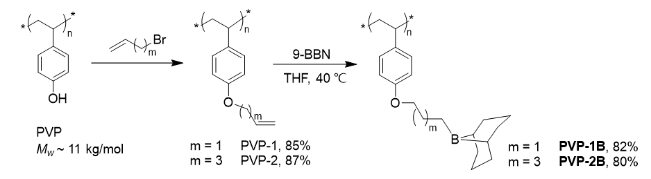 大分子硼路易斯酸的合成路线如图1所示。通过商品化的聚(4-乙烯基苯酚),经过两步法合成了大分子硼催化剂PVP-1B,通过“空气中静置实验”证明PVP-1B具有很好水氧稳定性。将PVP-1B的高耐水氧稳定性归因于以下几个因素: (1)硼和氧的超分子相互作用:这些相互作用有助于PVP-1B的紧密分子结构,减少了硼原子暴露于水分和氧气中机率,进而减少了氧化或水解反应的可能性。(2)较大的分子尺寸:大分子硼的结构因其较大的分子尺寸和体积,阻碍了水分和氧气扩散到聚合物溶液中,并限制了它们与硼烷单元的相互作用。(3)疏水性:PVP-1B表现出疏水性(不溶于水),进一步降低了水解反应的可能性。此外,硼烷中心的空p轨道与苯环的超分子相互作用对PVP-1B稳定性可能具有一定的贡献。