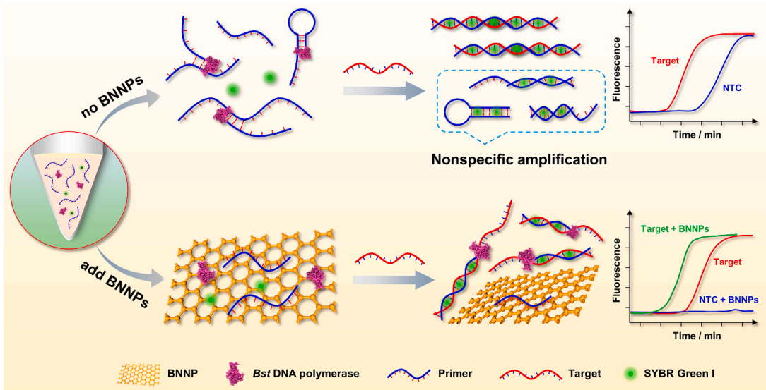 此外,以DNA扩增为基础的核酸检测已广泛用于分子诊断、食品安全监测和传染病预防。然而,引物二聚体的形成、发夹结构和错配杂交导致的非特异性扩增严重限制核酸检测技术的实际应用。因此,迫切需要探索一种提高核酸检测的特异性和灵敏度的方法。马翠萍教授团队证明了纳米材料氮化硼纳米片(Boron Nitride Nanoplate, BNNP),由于其独特的表面性质,可以与扩增反应的主要组分,如单链引物和BstDNA聚合酶相互作用,并提高溶液的导热性,BNNP的存在显著提高了PCR和环介导等温扩增(Loop-mediated isothermal Amplification, LAMP)的特异性(图2)。此外,BNNP还提高了LAMP的灵敏度,并且基于BNNP的LAMP的检出限比传统LAMP低两个数量级,同时此方法被证实可用于海产品中副溶血性弧菌的检测。这是首次系统地证明BNNP可以提高PCR和LAMP扩增反应的效率和准确度,从而极大地扩展了核酸检测在实验室和现场环境中的应用。