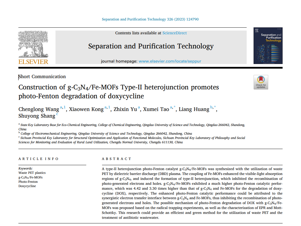化工学院陶旭梅教授团队在废塑料资源化用于光芬顿领域取得新进展,相关成果以“Construction of g-C3N4/Fe-MOFs Type-II heterojunction promotes photo-Fenton degradation of doxycycline”为题发表在国际知名期刊《Separation and Purification Technology》(影响因子8.6,中科院1区),共同第一作者为2020级硕士王成龙和2021级硕士孔晓文,通讯作者为陶旭梅与黄亮老师。WilliamHill官方网址为第一作者及唯一通讯作者单位。论文DOI链接为https://doi.org/10.1016/j.seppur.2023.124790。