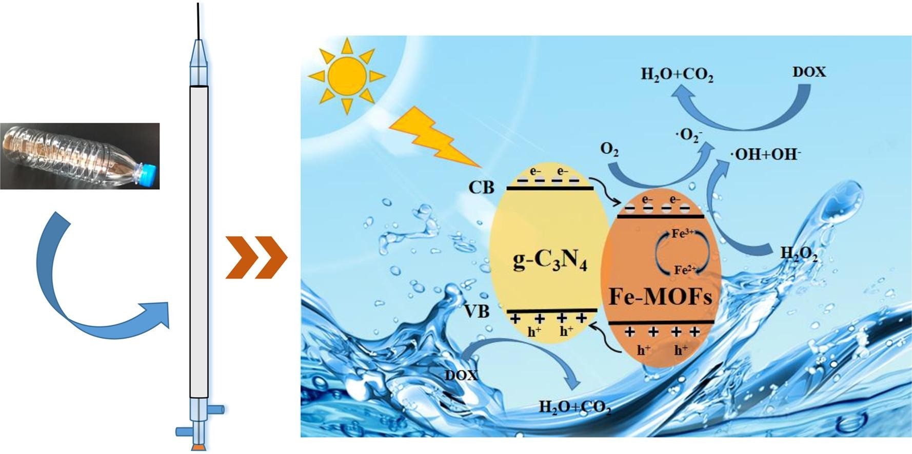 盐酸多西环素(DOX)作为一种抗生素广泛用于人类和动物的细菌感染。由于抗生素具有优异的抗菌性能和稳定的化学结构,传统的处理方法无法有效地将其从水中去除。Fe-MOFs暴露了丰富的配体-不饱和Fe位点,可以与H2O2强烈相互作用,且具有广泛的可见光响应和高的化学稳定性,使其成为合适的芬顿催化剂。g-C3N4与MOFs之间形成的复合界面可以增加表面静电相互作用,获得独特的孔隙率和形态,抑制光激发下电子-空穴对的快速成键。结合Fe-MOFs和构建异质结的优点,可以开发Fe-MOFs/g-C3N4异质结催化剂来提高光芬顿降解性能。