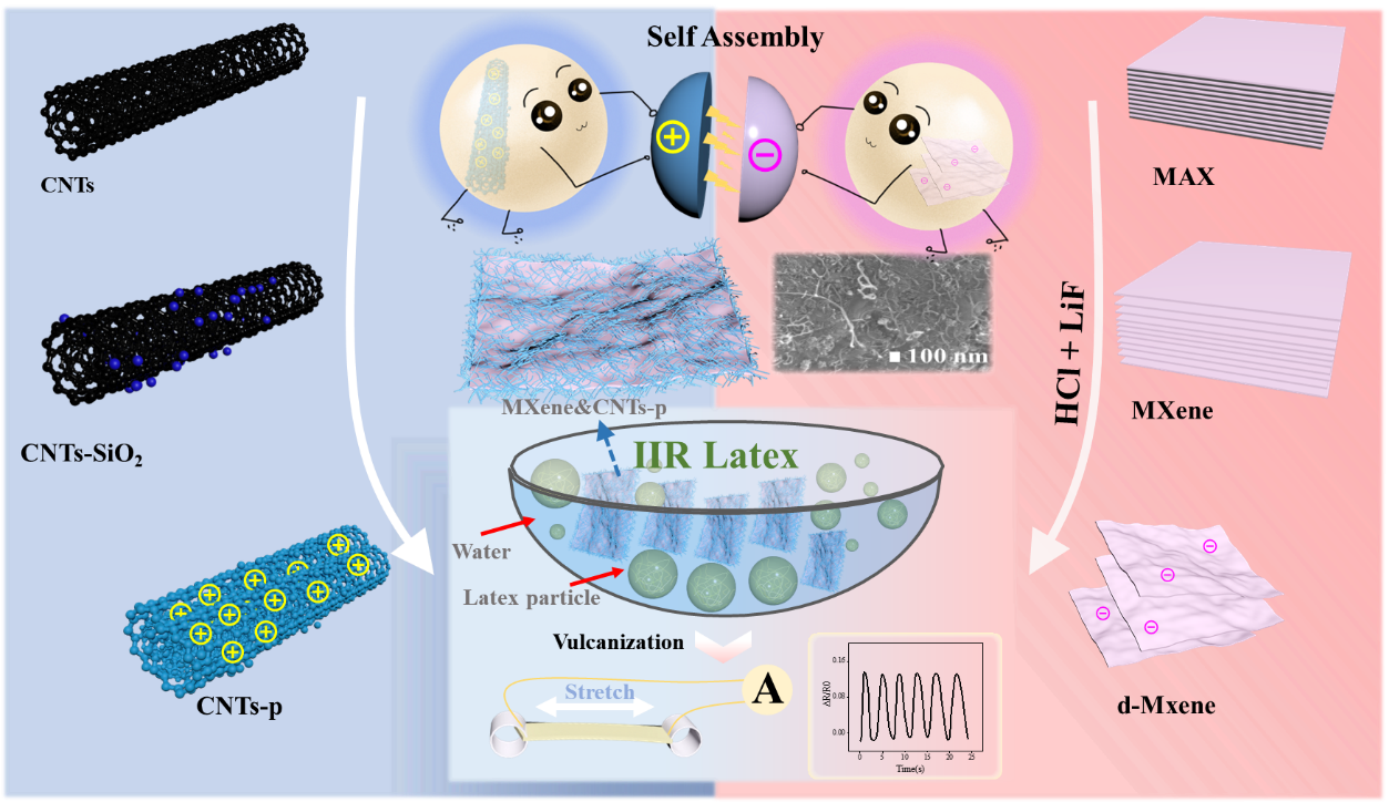 近年来,由于具有良好的可拉伸性,柔性应变传感器在工业制造和日常生活中受到了广泛关注。提升柔性传感器的灵敏度和可靠性一直是实际应用所迫切需要的。该团队设计了能与MXene进行静电自组装的多壁碳纳米管,制备出导电杂化填料,然后通过液相共混实现了在弹性基体丁基橡胶的良好分散,最终制备出具备高效的三维导电网络的导电聚合物复合材料。组装导电填料是由一维棒状结构和二维片状结构自组装所得到的,在具有较大的电子传输通道的同时又有丰富的接触位点,克服了单填料体系在聚合物基体中由于接触位点少所造成的导电体系不发达的缺点。组装导电填料在聚合物基体中形成了非常发达的三维导电网络。得益于这种特殊的导电网络,传感器表现出非常高的灵敏性(GF=35137)和可靠性(循环1万次以上)。同时,传感器具有宽检测范围(0-431%)和优异的稳定性,在强酸、强碱、高温、低温下均可实现应变传感功能。传感器的制备为如何提高柔性传感器的灵敏度和可靠性提供了解决思路,在可穿戴智能电子领域、健康检测和人机交互等领域有着广泛的应用前景。