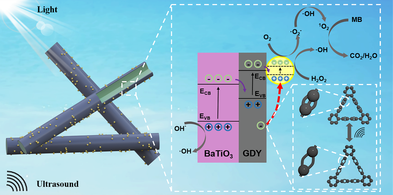 本研究构建了一种由钛酸钡/石墨炔/金纳米纤维(BTO/GDY/Au NFs)组成的异质结构。石墨炔(GDY)层的加入起到了电子海绵的作用,显著提高了压电光催化活性,其降解速率常数是BTO/Au的3.3倍。理论计算表明,BTO在超声下会发生弹性形变,从而导致GDY在7.1至10.4 Å的晶格常数范围内发生拉伸和压缩,这种形变诱导了sp杂化的C≡C向C=C的可逆转换,释放出的电子可与金纳米粒子(Au NPs)产生的热空穴复合。因此,更多的热电子能够参与催化反应过程。此外,BTO/GDY/Au NFs在快速降解废水中的有机染料和抗生素方面表现出优异的催化性能,同时还能抑制细菌繁殖。上述结果验证了这种异质结构在实际应用中的可行性。总之,本研究提出了一种新型压电光催化剂,其中GDY中sp杂化化学键的相互转化可作为电子供体,从而显著提高压电光催化性能。