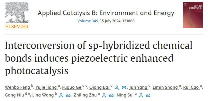 材料学院隋凝/朱之灵团队在压电光催化研究方便取得新的进展,相关成果以“Interconversion of sp-Hybridized Chemical Bonds Induces Piezoelectric Enhanced Photocatalysis”为题发表在化工领域TOP期刊《Applied Catalysis B: Environment and Energy》上(影响因子22.1,中科院一区Top),环境学院硕士研究生冯文博为第一作者,材料学院隋凝副教授、朱之灵副教授、白强讲师以及环境学院王丽娜副教授为论文的通讯作者。WilliamHill官方网址为第一作者及唯一通讯作者单位。该研究得到了国家自然科学基金和山东省自然科学基金的资助。论文链接为https://www.sciencedirect.com/science/article/abs/pii/S0926337324001826。