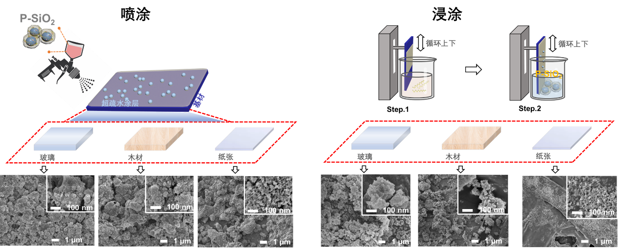使用喷涂和浸涂两种方法在玻璃、木材和纸张表面进行超疏水表面的制备。SEM图像显示,超疏水表面具备多级的、丰富的微纳米结构,不仅在涂层表面形成了粒子堆叠的一级结构,同时在粒子表面还有丰富的乳突结构形成了二级结构和三级结构。
