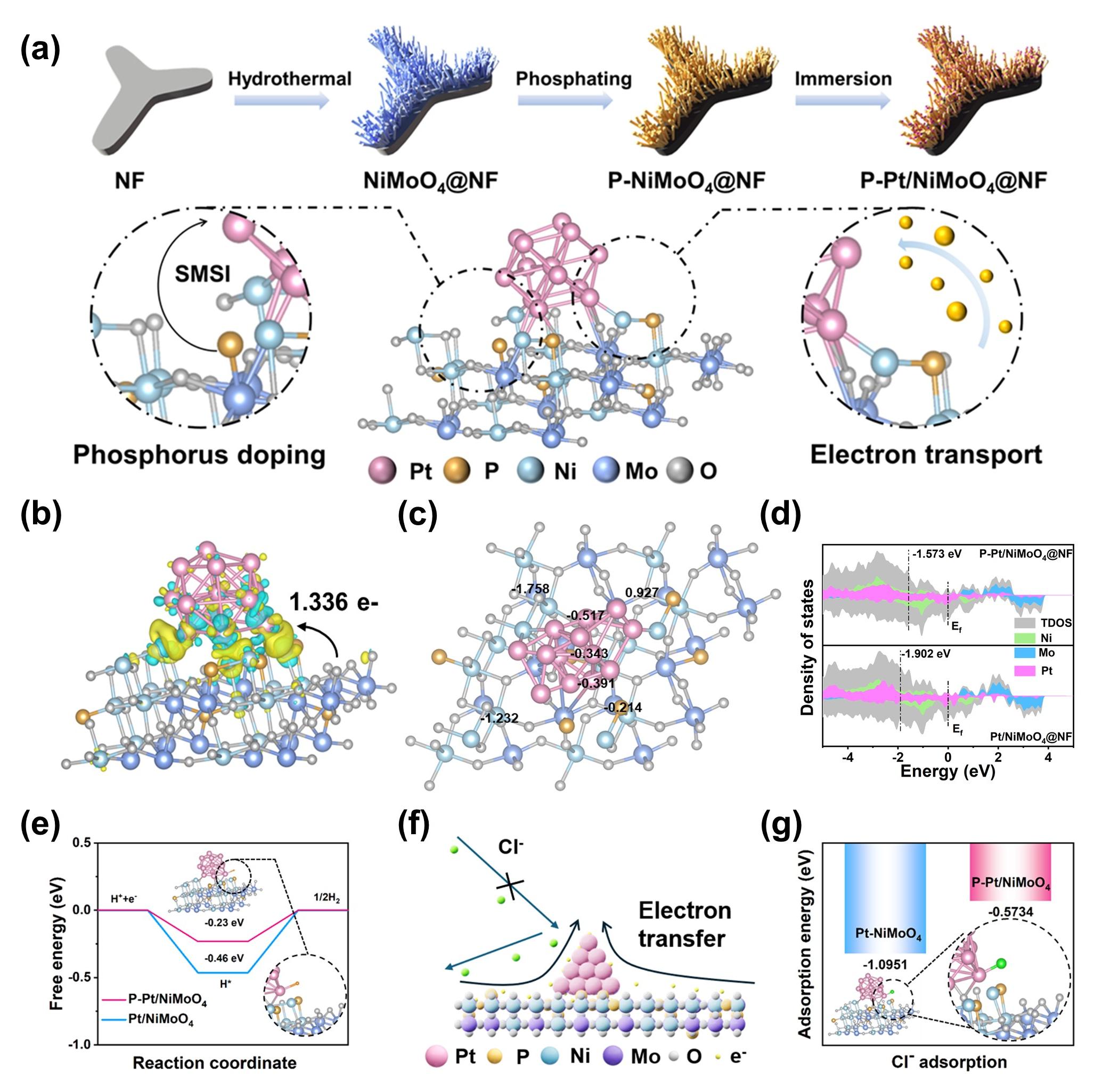 图3.P-Pt/NiMoO4@NF的强金属载体相互作用机理及反应理论计算图。