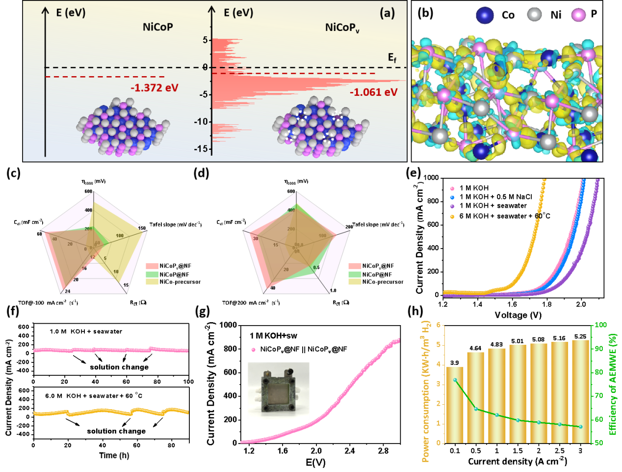 首先,在理论计算预分析的指导下,王磊教授团队通过缺陷工程实现了NiCoP的电子再分布,使催化剂在碱性海水溶液中对析氢/析氧反应(HER/OER)具有优异的催化活性和稳定性。Pv降低了催化剂表面的电氧化重构能垒,使得在OER中更容易驱动晶体局部转化为活性羟基氧化物。采用NiCoPv@NF组装的阴离子交换膜(AEM)电解槽具有高活性和长期稳定性,在100 mA cm-2时的工作效率高达77.0%,每加仑汽油当量的H2价格低至0.87美元,这为过渡金属磷化物在海水电解过程中的工业利用开辟了一条前景广阔的道路。(Adv. Energy Mater. 2024, 2400975)