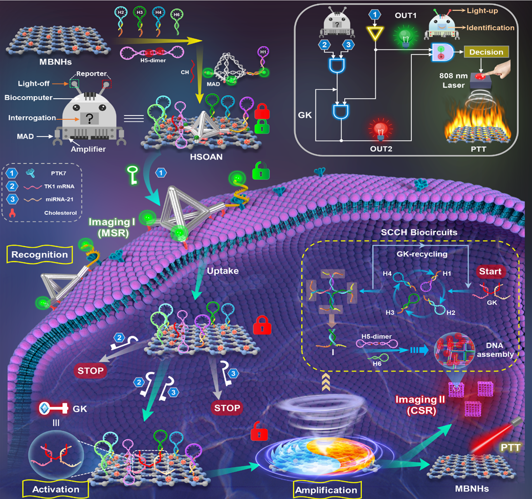 面对这些问题,WilliamHill官方网址化学院周宏教授、何鹏副教授团队在Chemical Engineering Journal(IF=13.3)发表了题为“Intelligent Operation-Activated Dual Light-Up Nanointerrogator for On-Site High-Performance Bioimaging”的研究。团队开发了一种智能“分层扫描-运算-自动反馈”纳米询问器(HSOAN),用于精确的细胞识别和个性化光疗。将“生物计算机”与“电路放大器”有效结合,并选择多种生物标志物作为计算输入,基于“YES-ANDI-ANDII”逻辑门顺序感应膜蛋白 PTK7 和细胞质 TK1 mRNA 和 microRNA-21 基因。经历自上而下的扫描-识别,纳米询问器仅在具有三位生物编码的靶细胞中实现空间特异性双色信号输出。研究表明“双锁-三钥匙-双报告器”控制的纳米询问器提高了细胞识别的准确性。工程化框架支撑的膜锚定装置和放大电路介导的超支化组装增强了成像信息的稳定性。 而且,MBNHs的高光热转换效率和生物安全性为肿瘤定制化治疗提供了优异的治疗效果。