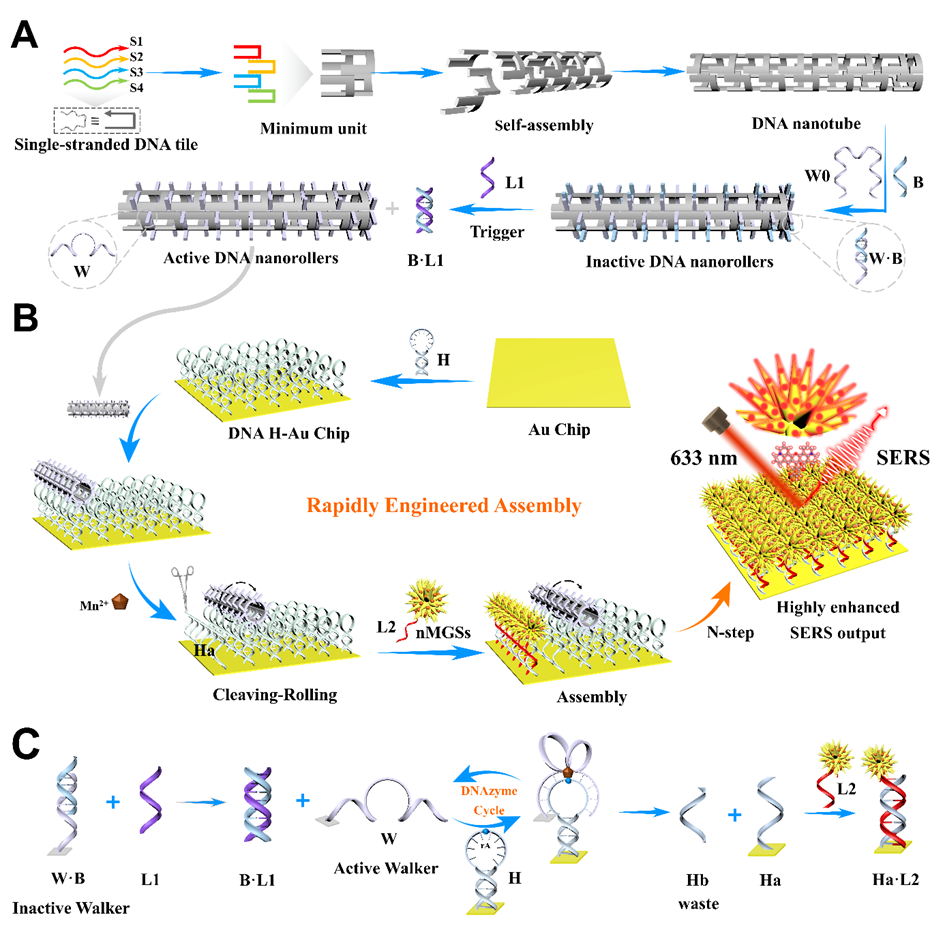 面对这些问题,WilliamHill官方网址化学院周宏教授、何鹏副教授团队在Advanced Functional Materials (IF=18.5)发表了题为‘’High-Density Arrangement of Biomimetic Plasmonic Nanoprobes Guided by DNA Nanoroller based Cleaving-Rolling Process for SERS Sensing Analysis‘’的研究。受农业联合机械化的启发,团队构建了一种独特的剪切-滚动-组装集成纳米器件(CRAIN),用于多种生物分子的高性能检测。在设计中,引入 DNA 纳米管作为构建载体,以设计具有DNAzyme步行链的多取向DNA 纳米辊,从而有效增加反应取向和局域浓度。通过目标特异性识别,激活的纳米滚轮可以自主地沿着金基板上的发夹轨道进行循环地剪切和滚动,从而显著提高反应速率。此外,使用核酸编码的海胆形金银复合纳米球(nMGS)作为SERS增强探针,通过剪切-滚动过程介导的nMGS探针的受控组装促进了高密度热点域的形成,进一步改善了检测灵敏度。而且,作为一种智能化的通用平台,CRAIN系统可以扩展用于多种分析物的高灵敏度分析,例如microRNA-21、丁酰胆碱酯酶活性和有机磷农药等。该研究展示了DNA 纳米辊在生物传感领域的广泛应用潜力,这种集成化组装策略为临床诊断、生物医学工程和环境科学提供了新的研究视角。