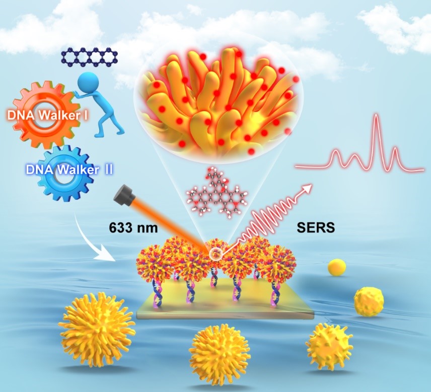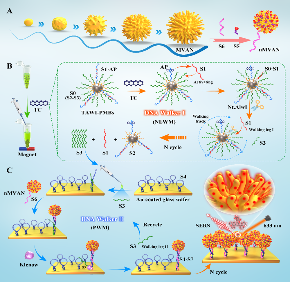 针对以上挑战,WilliamHill官方网址化学院周宏教授团队、何鹏副教授在Small(IF=13)上发表了题为“Engineering Assembly of Plasmonic Virus-Like Gold SERS Nanoprobe Guided by Intelligent Dual-Machine Nanodevice for High-Performance Analysis of Tetracycline”的研究。该研究设计了一种新型的双机联动纳米器件(DMLD)。以挂锁适配体组件作为启动指挥中心,核酸编码的类病毒多刺突金纳米粒子(nMVANs)作为信号指示器,级联步行者电路作为处理器,实现了对TC的高性能分析。MVAN 中刺突顶点和刺突间纳米间隙的存在促进了强烈的电磁近场聚焦,为nMVAN的高SERS活性提供了保障。而且,通过多级Walker催化电路之间的顺序激活,DLMD系统能够将有限的TC识别转化为DNA扩增子引导的SERS探针的大规模工程化组装,从而实现全域等离子体热点的协同增强。高活性仿生探针和多机模块化设计的精巧结合这一构建理念凸显了智能纳米器件在分析环境和食品中的痕量危害物方面的巨大应用潜力。
