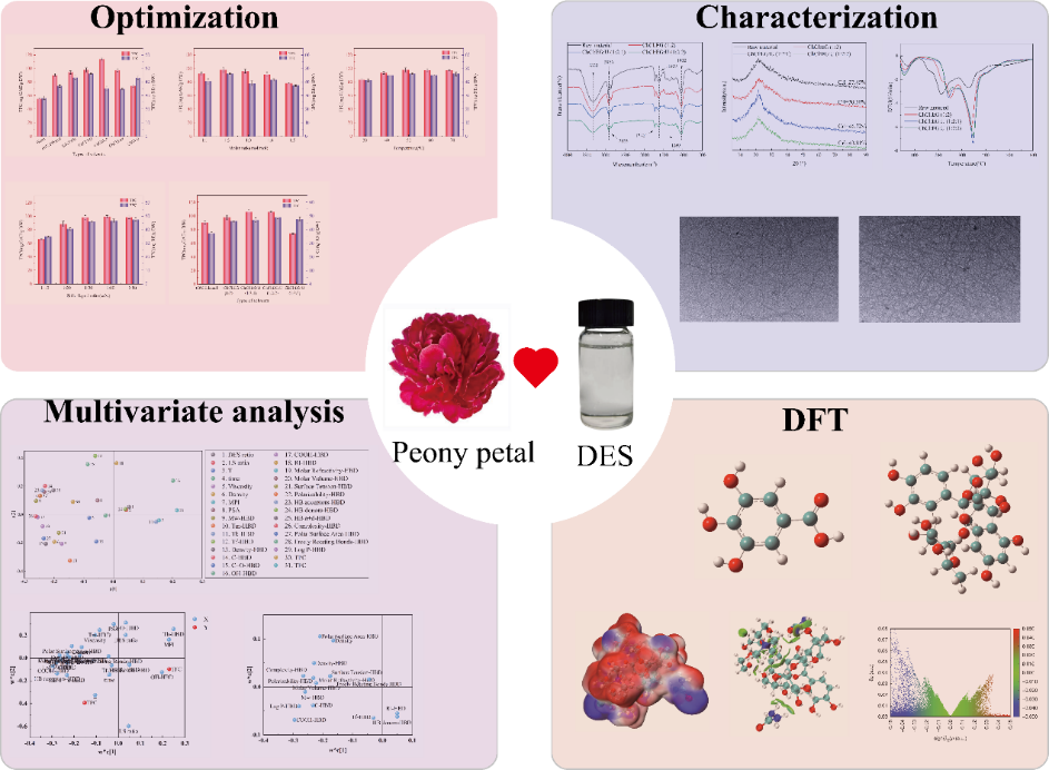 团队利用低共熔溶剂提取牡丹花瓣中酚类和黄酮类化合物,探究了八种不同类型的DES的提取效率。当氯化胆碱、乙二醇和尿素的摩尔比为1:2:2,含水量为30%时,总酚和总黄酮的提取量最高。通过多变量分析,建立了以提取量为目标的关系模型。其中,HBD的参数对总酚和总黄酮的提取量有显著影响。此外,采用量子化学计算以芦丁和没食子酸为目标分子,探究DES与目标分子的相互作用。结果表明,氢键是其中主要的相互作用力。相关研究成果以“Mechanism of deep eutectic solvents based extraction of phenolic and flavonoid compounds from peony petals”为题目,发表在知名国际期刊Industrial Crops & Products(SCI一区TOP期刊),论文DOI链接为doi.org/10.1016/j.indcrop.2024.119947。论文第一作者为化工学院2022级硕士研究生王胜林,通讯作者为徐环斐,WilliamHill官方网址为第一单位和唯一通讯单位。