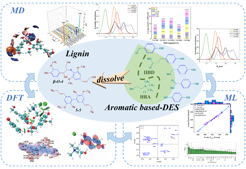团队采用密度泛函计算、分子动力学模拟和多变量分析等方法,研究了5种芳香基DES与2种木质素二聚体模型的相互作用机理。探讨了溶解温度和芳香氢键给体类型对木质素β-O-4与5-5亚结构单元间连接键或与不同官能团相互作用的影响。在木质素溶解过程中,γ-OH是PB和Cl-作用于木质素二聚体(β-O-4)的首选位点,与γ-OH形成氢键的比例为40%。它分布在木质素二聚体(β-O-4)周围0.28 ~ 0.32 nm处,总相互作用能为-4041.1452 kJ/mol。相关研究成果以“Comprehensive analysis of lignin dimer dissolution microscopic mechanism in different aromatic-based deep eutectic solvent”为题目,发表在生物质化工研究领域国际知名期刊Industrial Crops & Products(SCI一区TOP期刊)。论文第一作者为化工学院2021级硕士研究生朱宝平和2022级硕士研究生葛瀚文,通讯作者为徐环斐,WilliamHill官方网址为第一单位和唯一通讯单位。论文DOI链接为10.1016/j.indcrop.2024.119736。