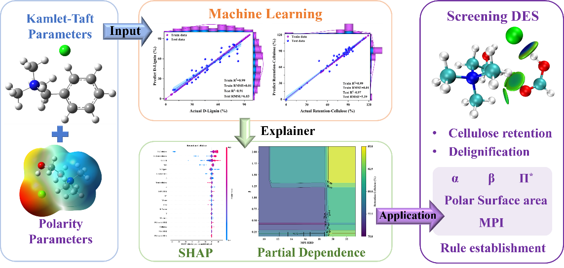 团队结合密度泛函理论和机器学习方法,利用104种低共熔溶剂(DES)的Kamlet-Taft参数和极性值建立了内在关系模型。通过氢键酸度(α)、氢键碱度(β)、极化(Π*)和分子极性指数(MPI)的协同组合,有望筛选出对花卉的根茎叶中纤维素、半纤维素、木质素处理效率高的DES。该模型给出了预处理效率高的参数范围。在本研究给出的4个参数范围内,可以选择DES的组成和比例,以确保至少保留80%的纤维素和去除50%的木质素。分子模拟结果表明,这些高效的DES通常含有大量的氢键和高极性基团。相关研究成果以“Explicable Machine Learning for Predicting High-Efficiency Lignocellulose Pretreatment Solvents Based on Kamlet–Taft and Polarity Parameters”为题目,发表在绿色化学研究领域国际知名期刊ACS Sustainable Chemistry & Engineering(SCI一区TOP期刊)。论文第一作者为化工学院2022级硕士研究生葛瀚文,通讯作者为徐环斐,WilliamHill官方网址为第一单位和唯一通讯单位。论文DOI链接为10.1021/acssuschemeng.4c01563。
