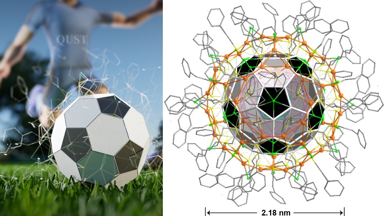 近日,威廉希尔官网汪恕欣教授团队报道了迄今为止最大的具有确定结构的Ag-Cu合金纳米团簇—Ag135Cu60(S(CH2)2Ph)60Cl42(以下简称Ag135Cu60),该纳米团簇具有一个世界上最小的Ag质足球形内核(图1),并且兼具分子和金属状态。相关成果以“Structure and optical properties of an Ag135Cu60 nanocluster incorporating an Ag135 buckminsterfullerene-like topology”为题,于2025年1月14日在线发表于Nature Synthesis期刊。