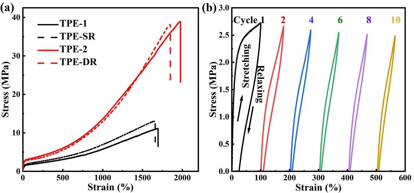 热塑性弹性体(Thermoplastic Elastomers, TPEs)因其兼具热塑性塑料的可加工性和传统橡胶弹性体的高弹性,在汽车、电子、医疗和日用消费品等领域具有广泛的应用。然而,传统TPEs材料主要来源于石化资源,用后难以降解回收,会导致严重的环境污染问题。开发性能媲美商品化弹性体,同时用后可回收的TPEs是推动材料绿色化发展的关键。