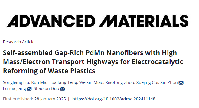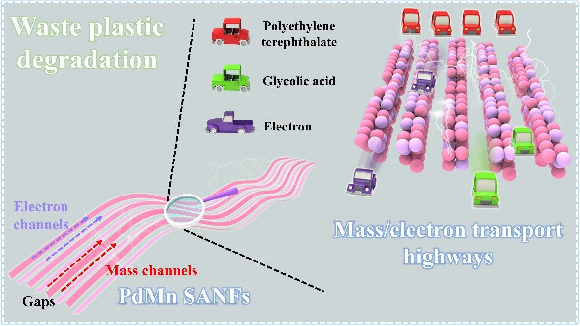 针对上述问题,威廉希尔官网材料科学与工程学院泰山学者姜鲁华教授团队在PET废塑料增值催化剂的研究方面获新进展,相关成果以“Self-assembled gap-rich PdMn nanofibers with high mass/electron transport highways for electrocatalytic reforming of waste plastics”为题,发表在国际材料领域TOP期刊Advanced Materials上(影响因子27.4)。全文链接:https://doi.org/10.1002/adma.202411148。该工作以WilliamHill官方网址为第一单位,材料学院姜鲁华教授为通讯作者,材料学院副教授刘松良为第一作者。