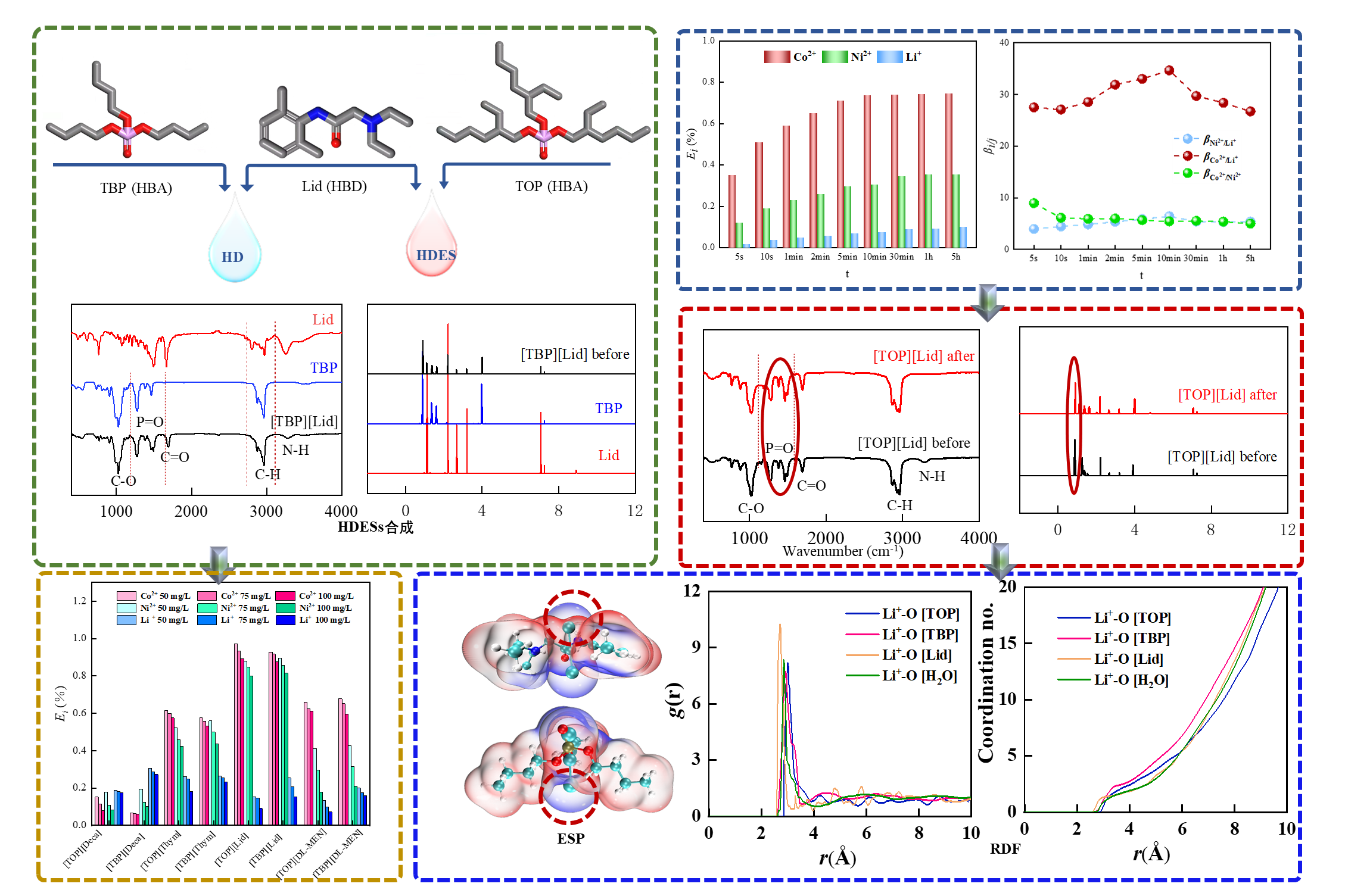 研究团队基于萃取时间、反应温度、水相pH以及有机相/水相比例等变量,进行了萃取条件的优化实验。在优化条件下,HDES[TOP][Lid]对Co²⁺和Ni²⁺的单级萃取效率分别达到了98.5%和83.9%;HDES[TBP][Lid]对Co²⁺和Ni²⁺的单级萃取效率分别为96.0%和82.9%。通过量子化学(QC)和分子动力学(MD)模拟,进一步揭示了HDES中金属离子的萃取机理。分子层面的分析表明,有价金属离子与HDES之间的静电和配位作用主导了金属离子的提取过程,其中Co²⁺和Ni²⁺与HDES的相互作用强度显著高于Li⁺与HDES之间的相互作用强度。