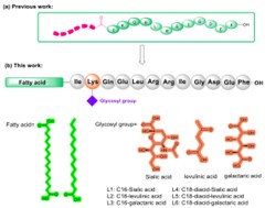 糖尿病是全球高发的代谢性疾病,开发长效、高效、无副作用的抗糖尿病药物是当前重大需求。传统多肽药物面临半衰期短、细胞膜穿透性差、溶解度低等瓶颈,尤其针对细胞内靶点(如蛋白酪氨酸磷酸酶PTPN1/2)的药物设计更是挑战。蛋白酪氨酸磷酸酶PTPN1/2是调控胰岛素和瘦素信号通路的关键细胞内靶点,但其高度保守的带负电活性位点使得传统小分子药物难以有效靶向,被认为是“不可成药”靶点。肽类药物在代谢疾病治疗中表现出巨大潜力,但面临膜通透性差、半衰期短和易被酶降解等问题。尽管脂肪酸修饰(如长链脂肪酸)可延长肽类药物的半衰期(如GLP-1受体激动剂司美格鲁肽),但其对细胞内靶点的通透性提升有限。因此,开发兼具长效性和细胞通透性的肽类抑制剂仍是当前研究的难点。
